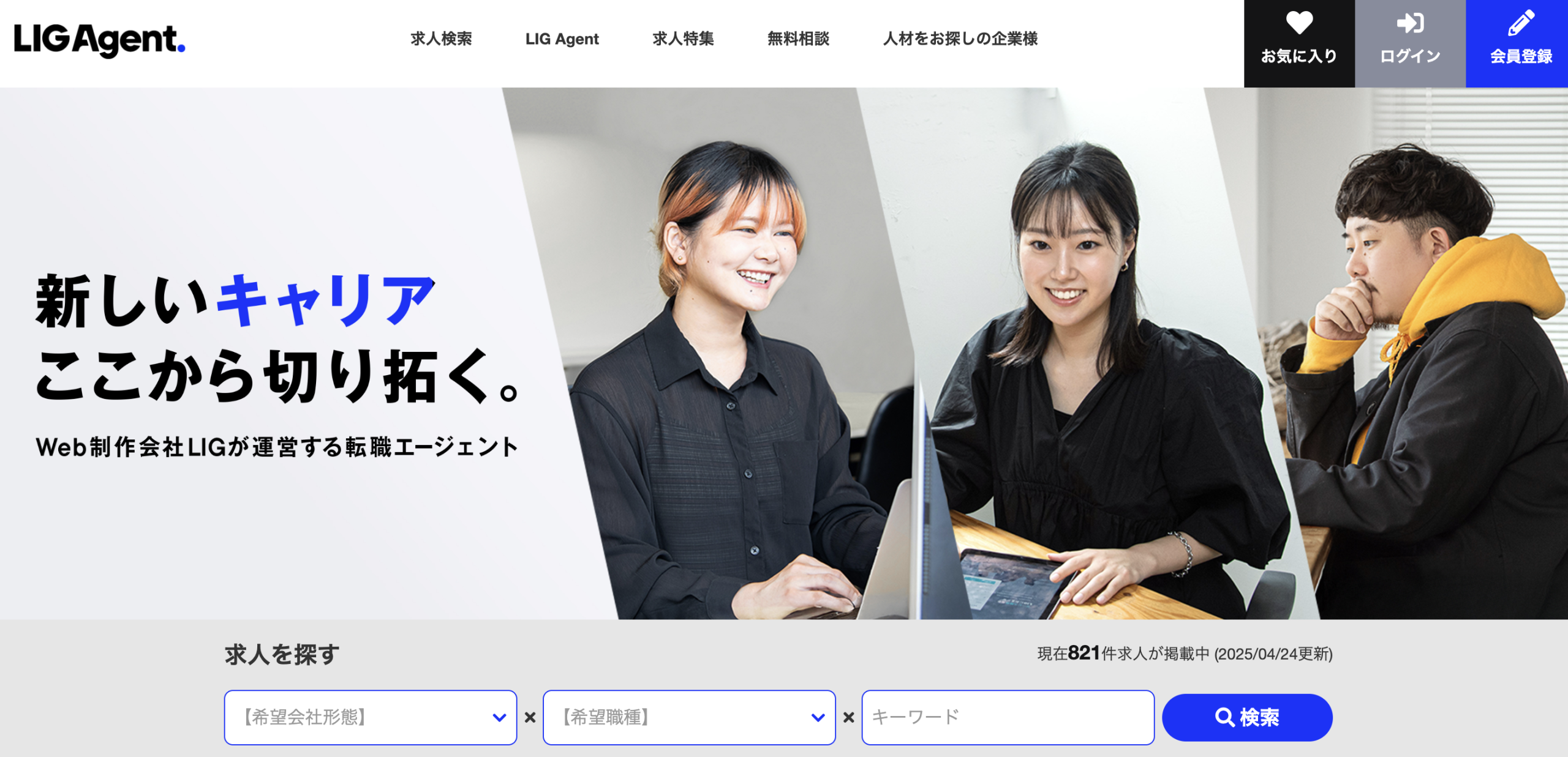Lig Agentは、クリエイター職種に特化した転職エージェントとして、業界の最新トレンドや技術に精通したサポートが受けられる点が魅力です。未経験者からハイクラス人材まで、幅広い層に対応しており、ポートフォリオの添削や面接対策など、転職活動全体を手厚くサポートしてくれます。クリエイティブ業界でのキャリアアップを目指す方にとって、有力な選択肢の一つと言えるでしょう。